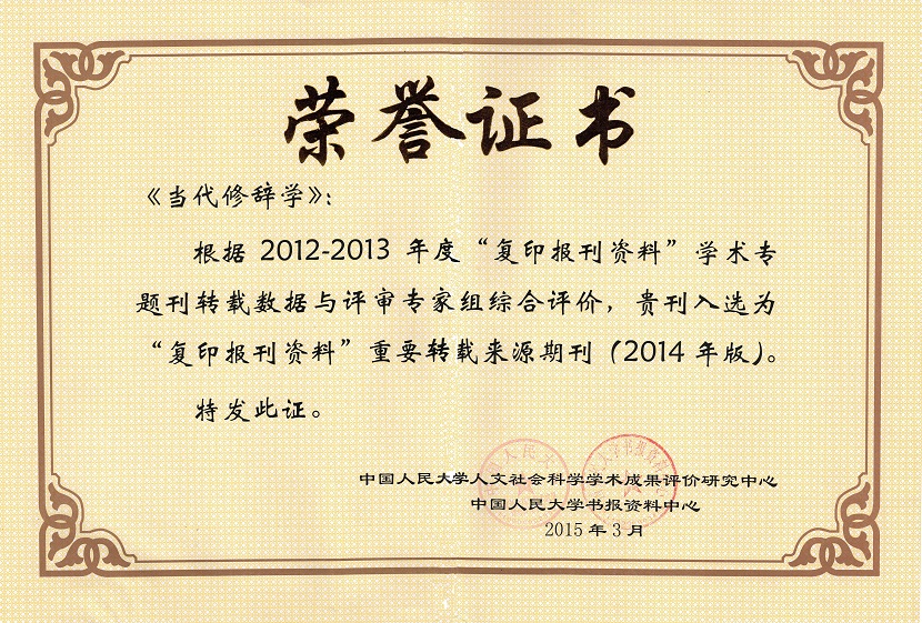 复旦大学主办的《当代修辞学》近日入选中国人民大学人文社会科学学术成果评价研究中心、中国人民大学书报资料中心研制的“复印报刊资料”重要转载来源期刊(2014年版)。